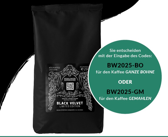 Das ist die Black Week in der Berliner Kaffeerösterei: Sie kaufen nach Herzenslust in unserem Onlineshop ein. Ab einem Einkaufswert von 74,90 Euro * schenken wir Ihnen 250g Kaffee unserer limitierten Sonderedition „Black Velvet Special Blend“, die nur zur Black Week 2025 erhältlich ist.