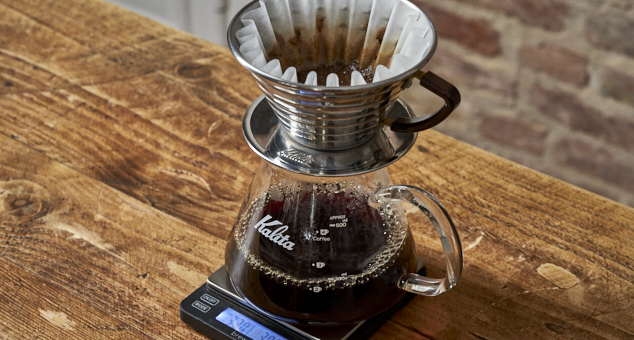 Durch den Abfall der Temperatur entsteht ein Unterdruck, der den Kaffee durch den Filter zurück in den Kolben saugt.