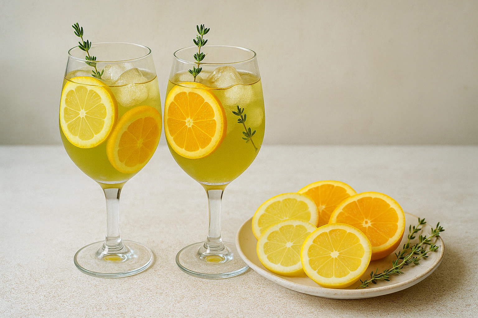 Füllen Sie ein großes Weinglas zur Hälfte mit Eiswürfeln und schichten Sie zwischen den Eiswürfeln die Orangen- und Zitronenscheiben. Füllen Sie nun die restlichen Zutaten auf und fügen zum Schluss den Thymianzweig hinzu. Prost.