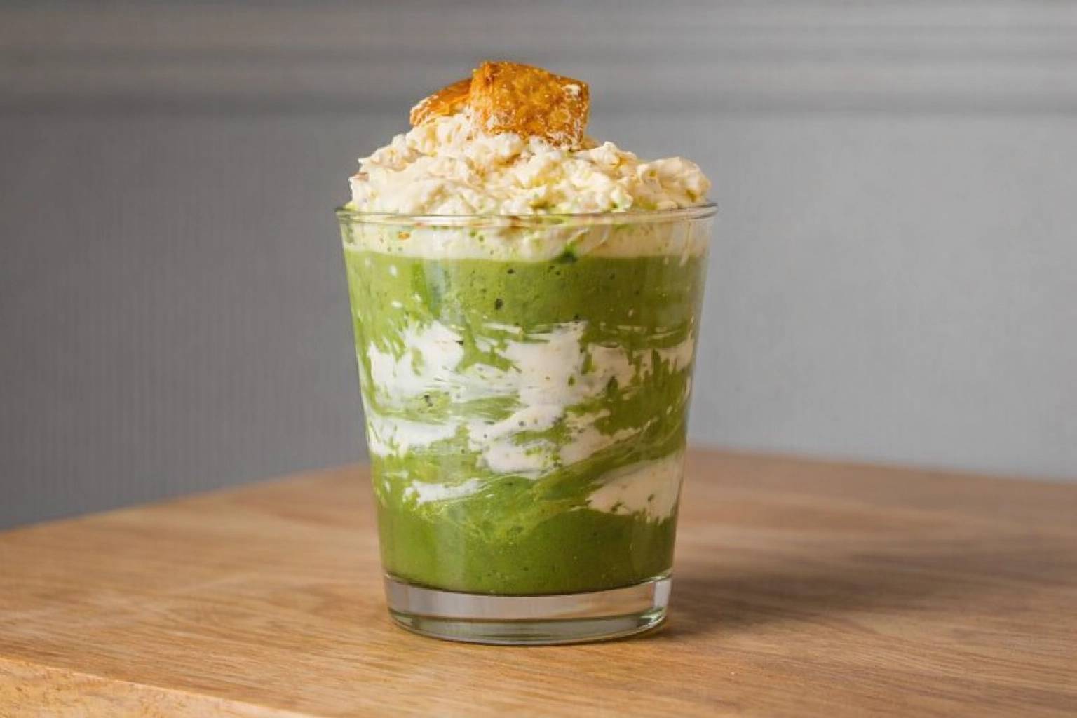 Setzen Sie zum Abschluss 1–2 Esslöffel der Banana-Pudding-Creme als cremiges Topping auf den Iced Matcha Latte und servieren Sie den Drink frisch gekühlt.