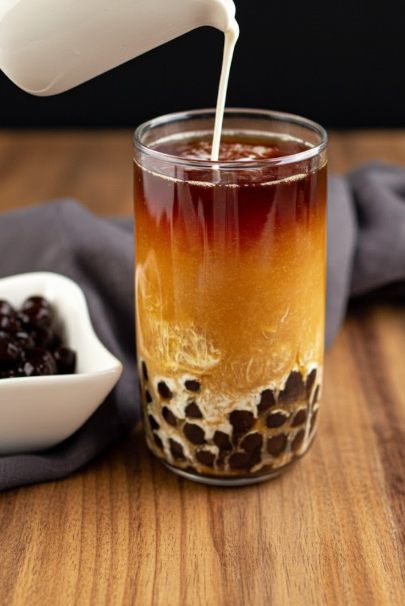 - Milchiger Klassiker: Schwarztee, Milch, Boba und etwas Vanille-Sirup.